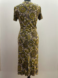 Original early 1960s vintage polyester dress in the style of 1940s, in rich colours of chartreuse green, yellow, lilac and white which sits just below the knee. The dress is a fitted wiggle style with drape effect sash from the shoulder and peplum detail to the waist in true 1940s style. Fastens with a metal zip to the centre back.