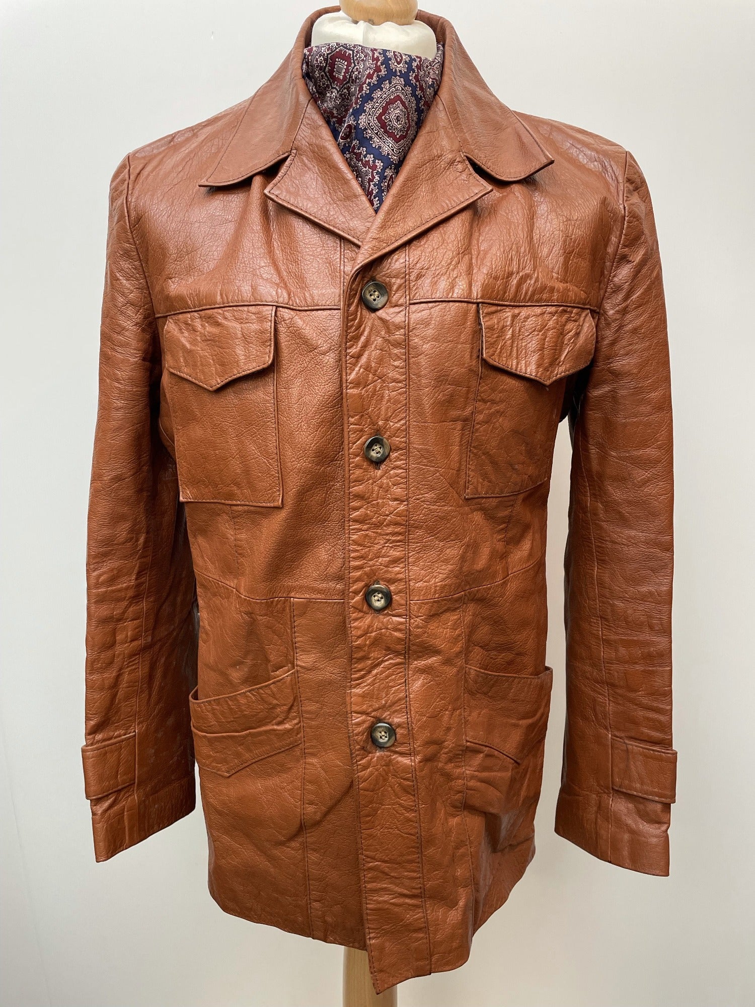 Mens original 1970s jacket by Windsor Leatherwear in tan leather. Button fastening and four front pockets.