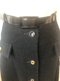 1970s A Line Button Front Skirt in black by Alexon. The design features two front decorative pockets and includes a patent waist belt. Made using 100% Wool in England and is fully lined.