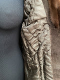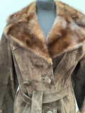Womens original 1970s vintage coat. Double breasted in brown suede. Real mink fur collar and cuffs. Tiger pattern lining with a fringed belt. Button fastening with side pockets.