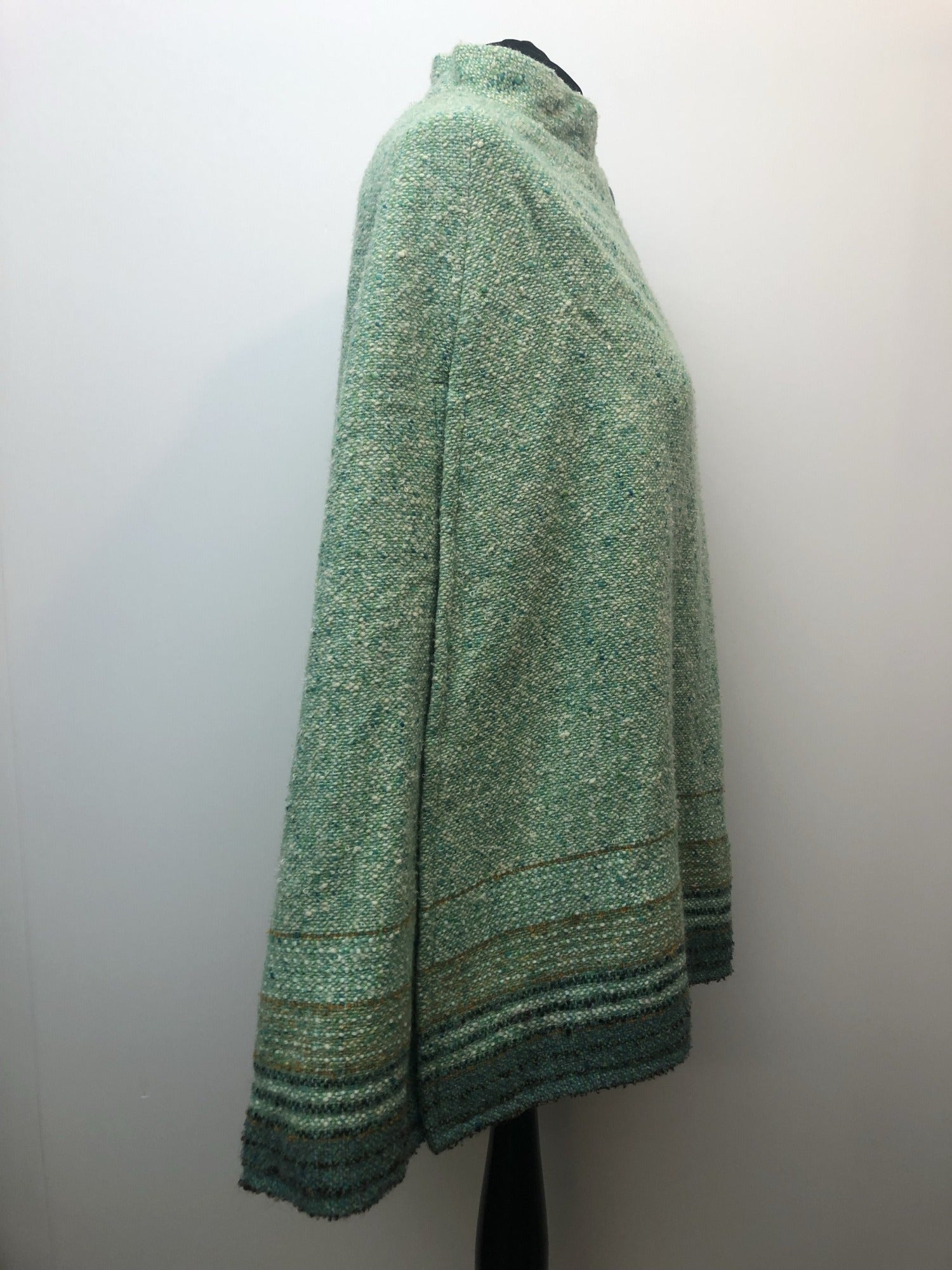 Vintage 1960s Green Striped Cape by R.O.K Model. The cape features a stripe detailing on the hem, a side button front fastening and a neck press stud. The design is fully lined with arm splits at the sides.