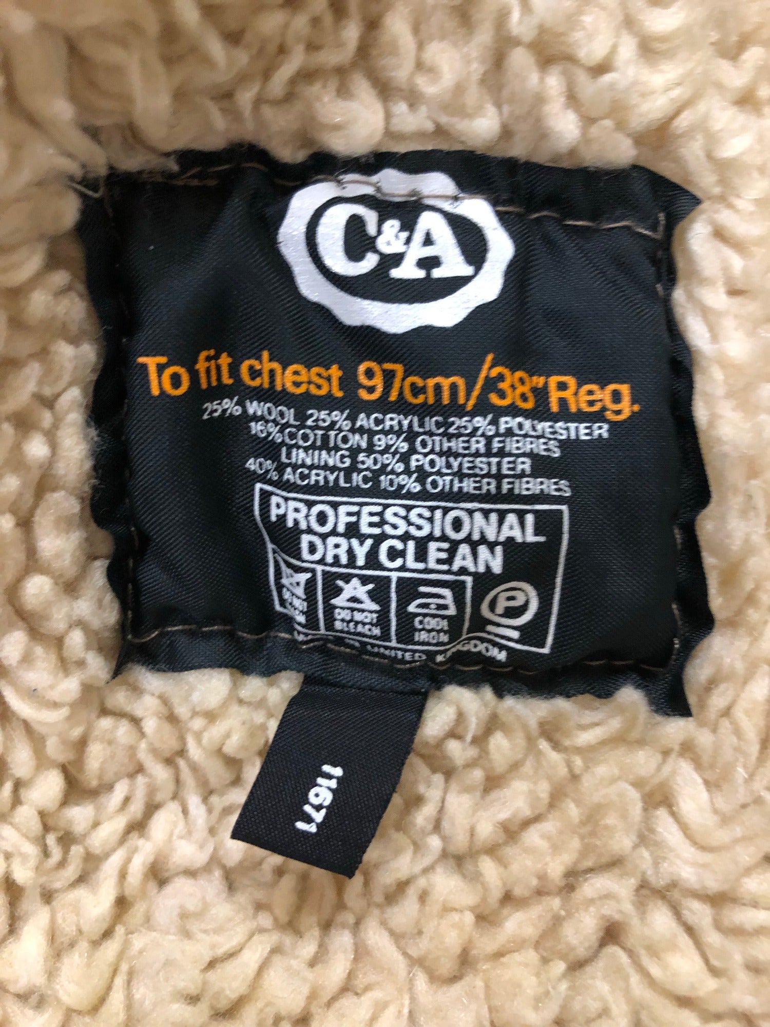Mens original 1970s Sherpa Lined Borg Trucker Jacket in brown by C&A. This Sherpa lined jacket features two front pockets and sherpa trims and cuffs, with a zip front fastening and buckle neck fastening.