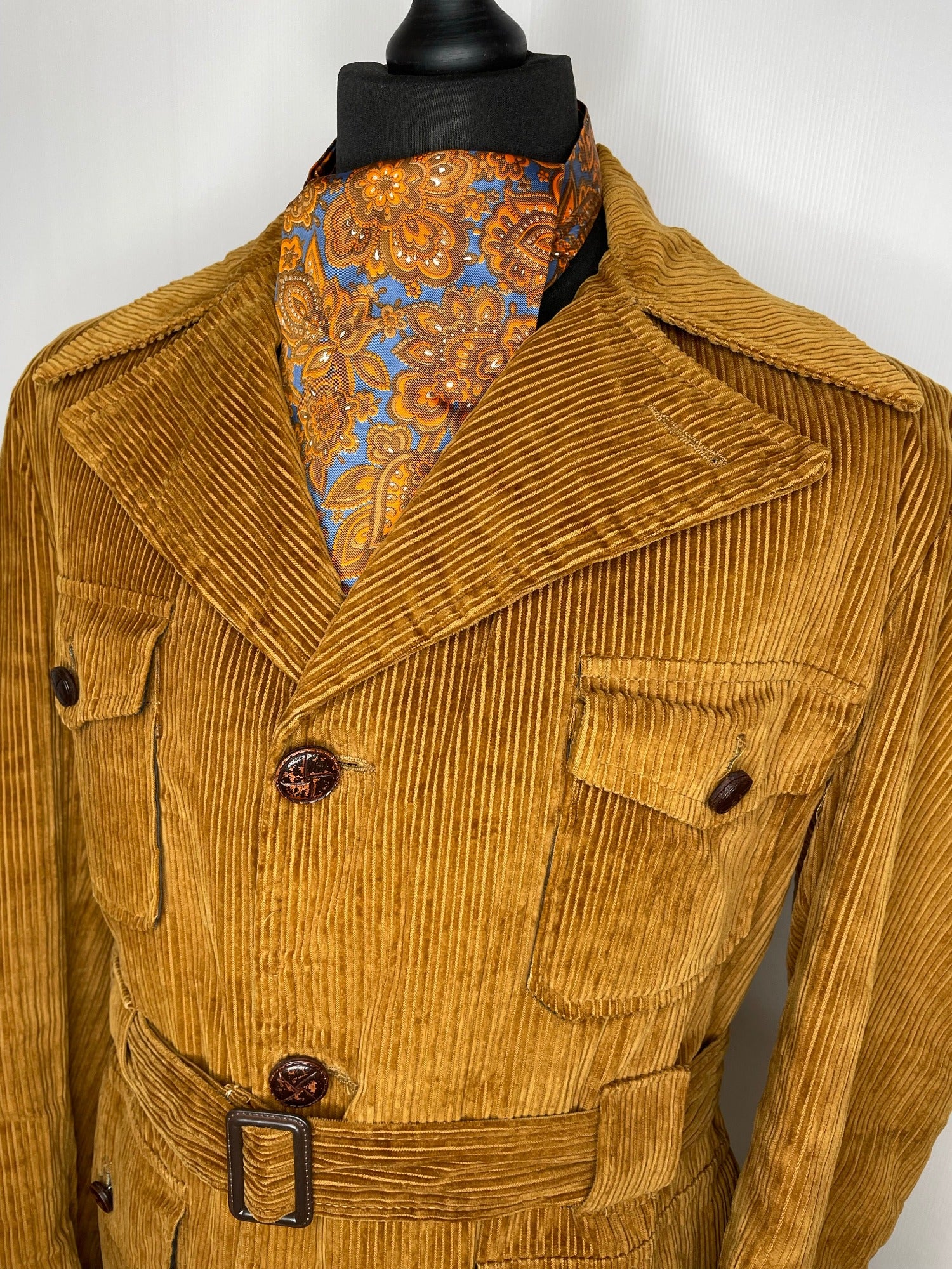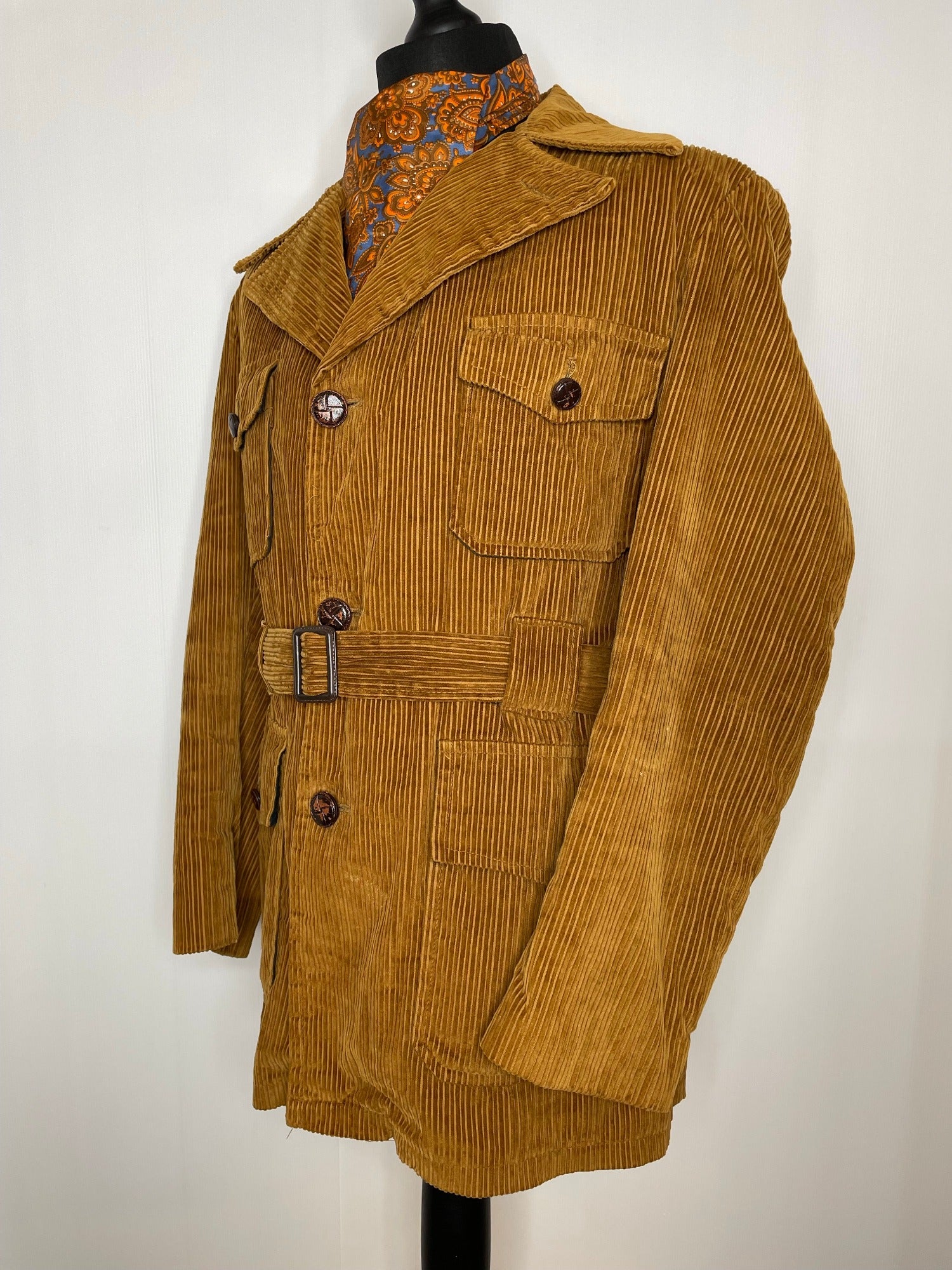 Mens original 1970s single breasted winter coat made of brown soft cotton corduroy with a warm faux sheepskin sherpa lining. Has wooden-look buttons to the front, two deep hip pockets and a removable waist belt plus large classic 70s large pointed collar. Made in USA.