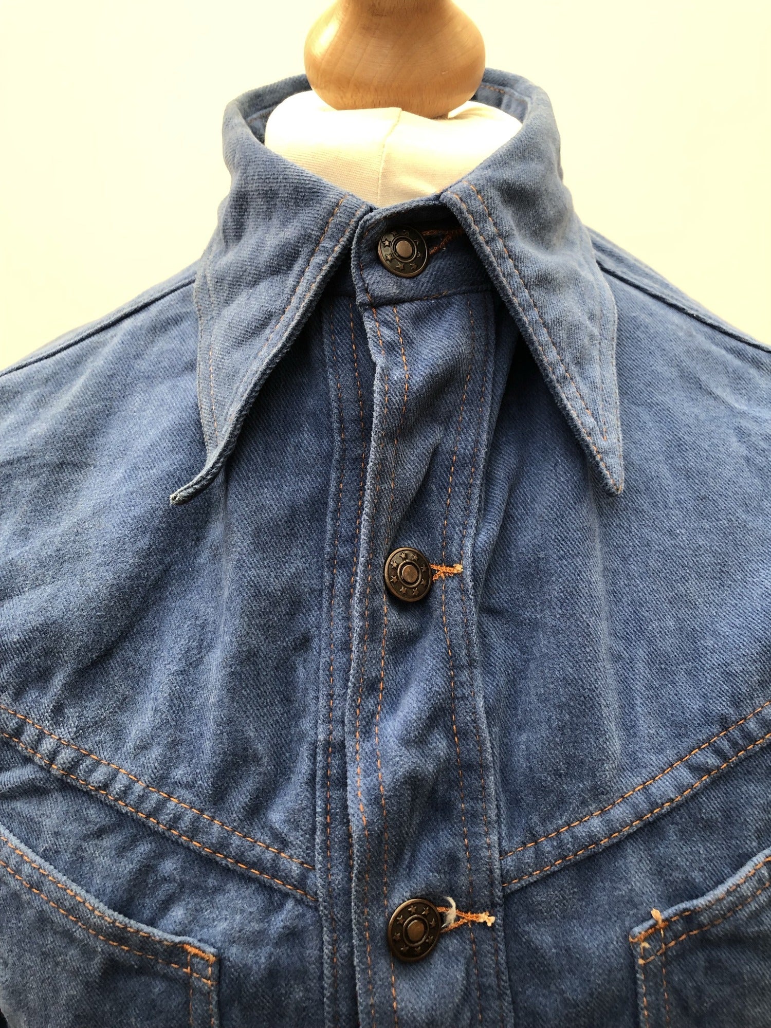 Mens vintage 1970s denim shirt jacket in blue. Features a button front fastening, two chest pockets and a dagger collar.