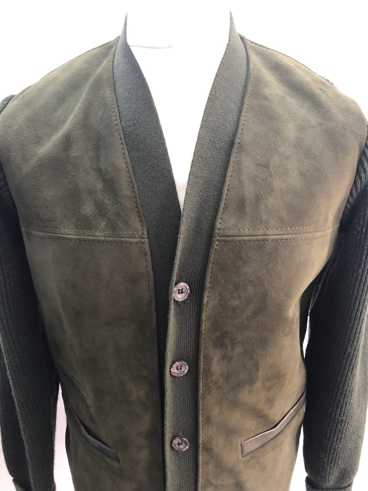 Mens original 1960s Cardigan by Mayborne of Bournemouth in Green. Features a Suede front with three front pockets and a knitted back and sleeves, with a button front fastening.