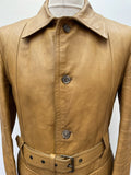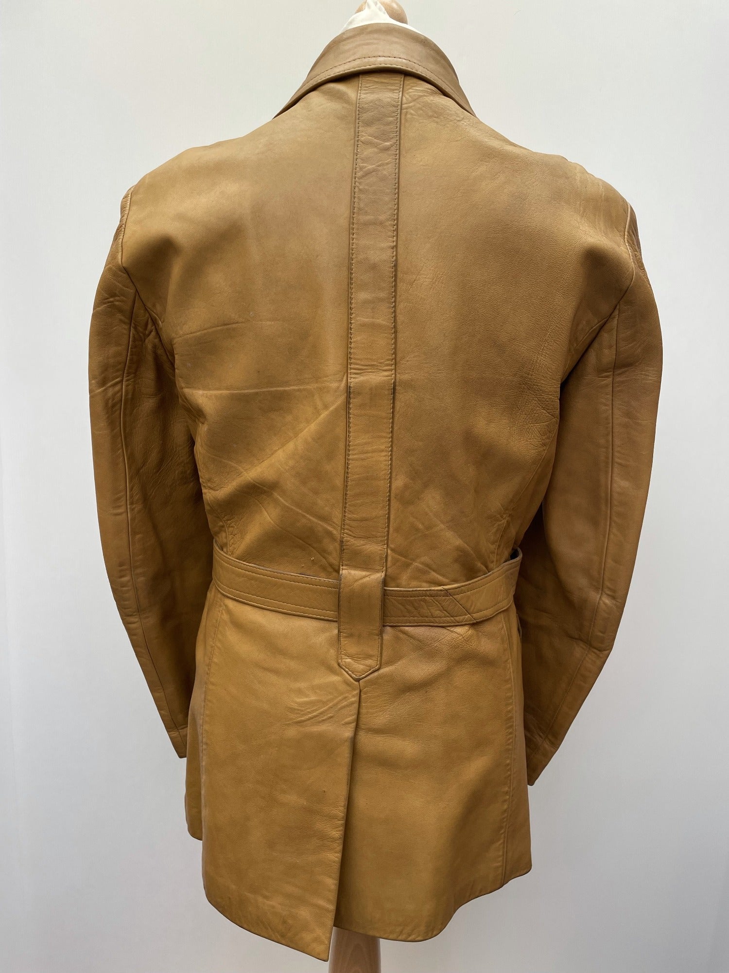Mens 1970s belted leather jacket by David Conrad in mustard. Button fastening with large collar and side pockets.
