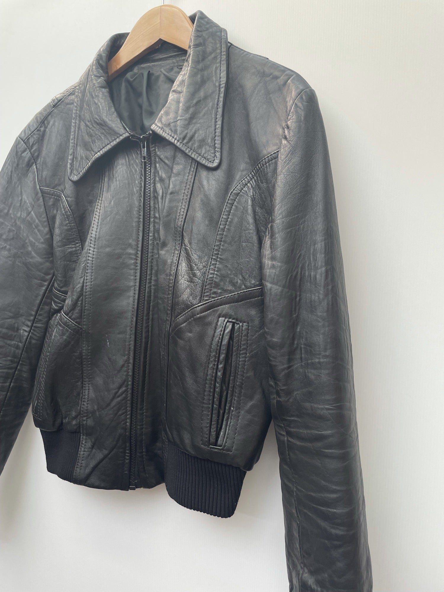 Mens original 1970s leather jacket in black. Shortcut style with zip fastening, side pockets and big collar. Elasticated cuffs and waistband, and lined inside.