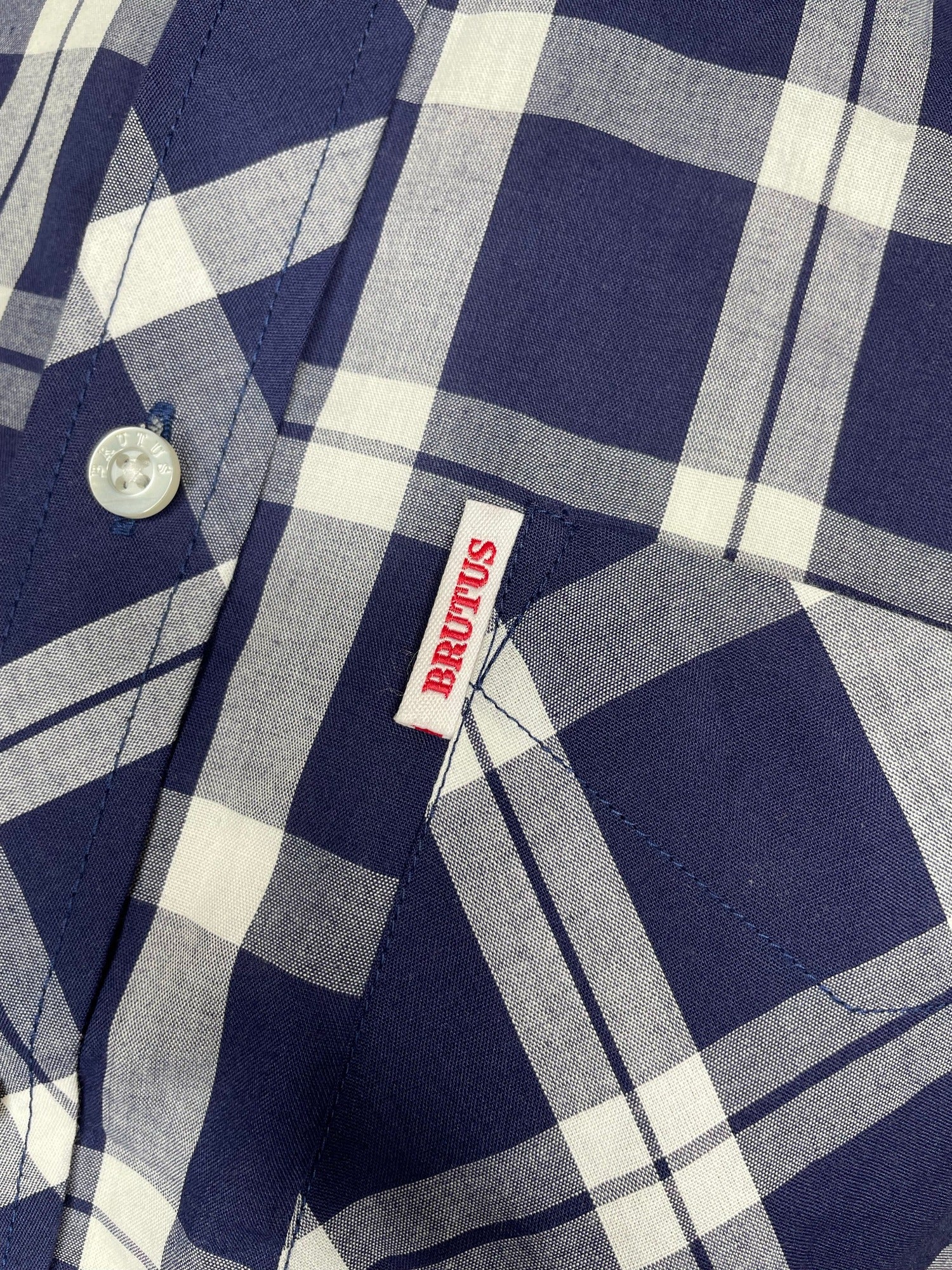 Mens short sleeve blue and white polyester and cotton mix short sleeve shirt by Brutus. Features buttons to the front and a chest pocket with red Brutus logo tab.