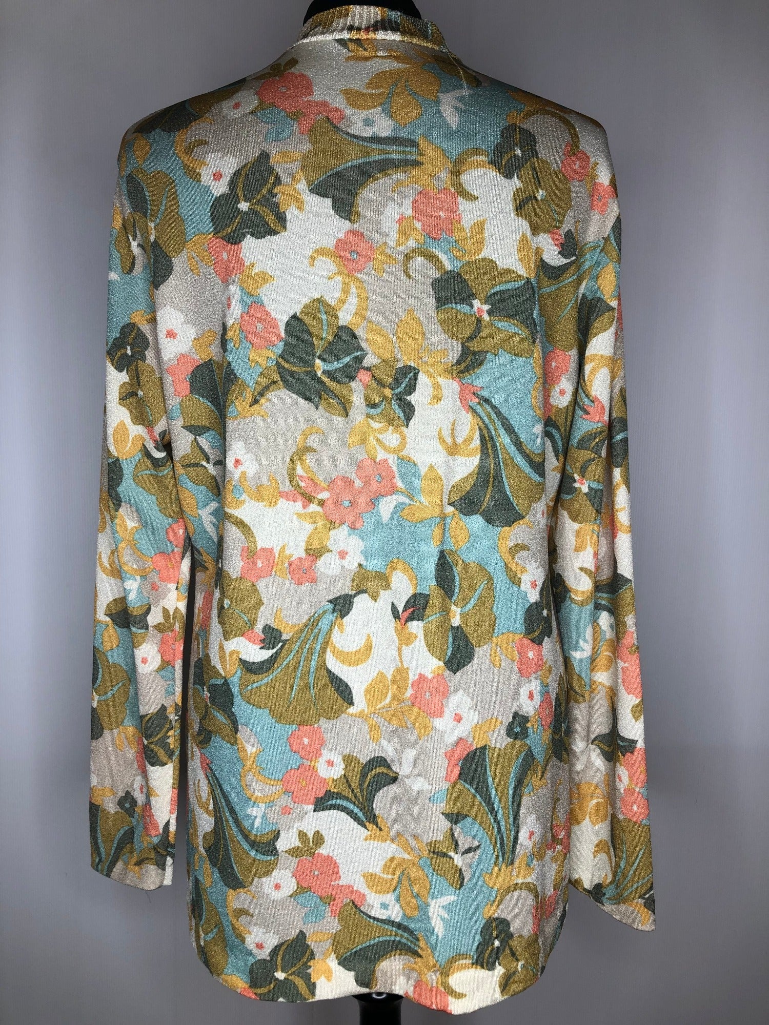 Womens original 1960s long sleeve crew neck top in a floral blue, green and peach lightweight knitted fabric.