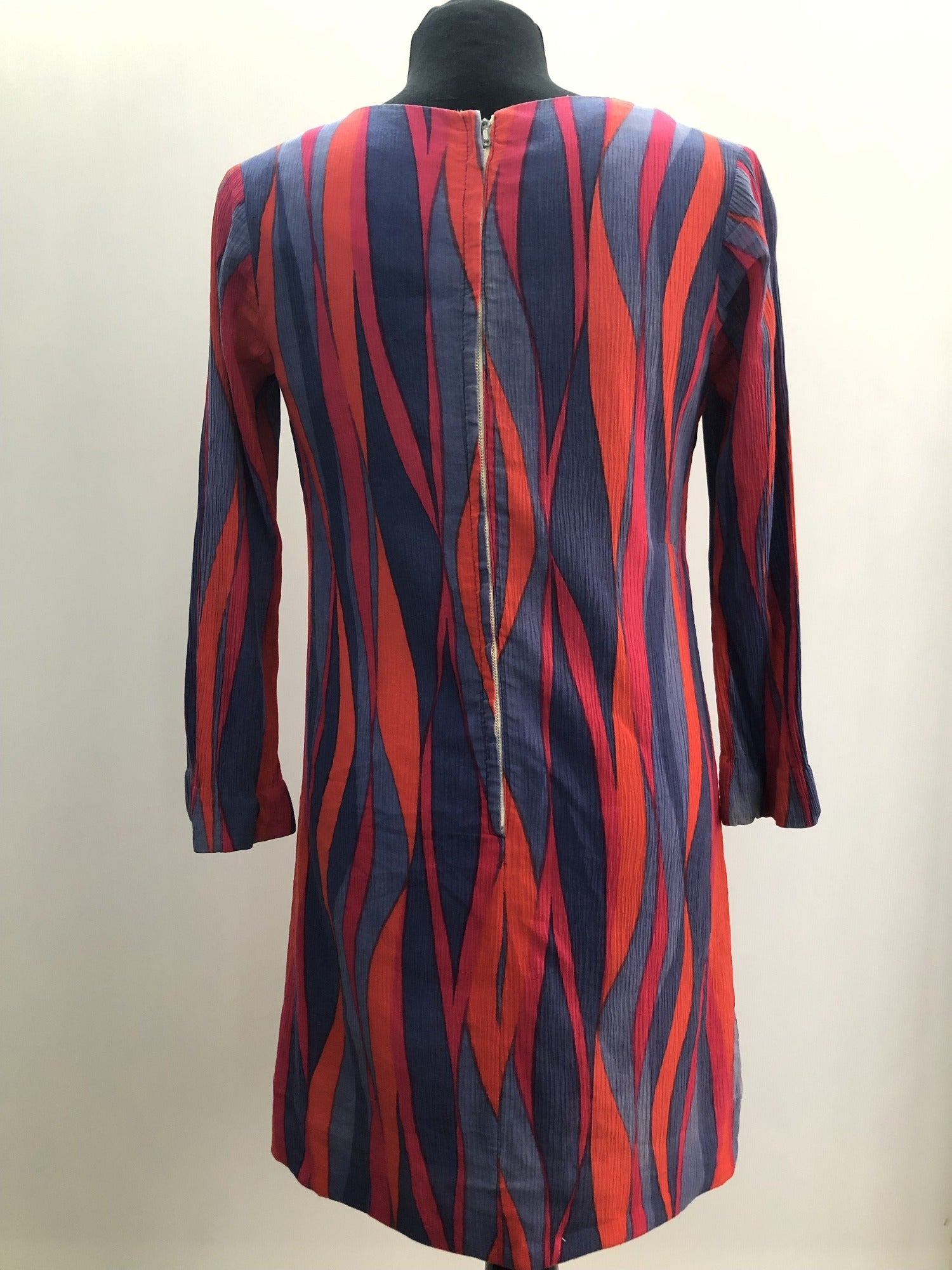 Womens original 1960s Long Sleeved Print Dress in Pink and Blue with a zip back fastening.