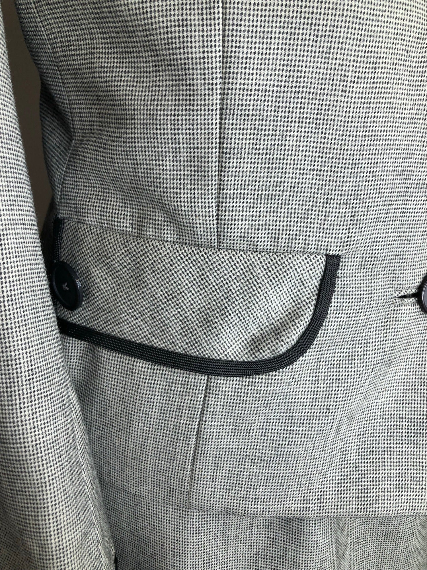 1960s Two Piece Jacket and Dress by Phyllis Taylor in grey. The dress features a round neck front, back zip fastening, a decorative front pocket with button detail and is full lining. The jacket has a button front fastening, two front pockets and is fully lined.