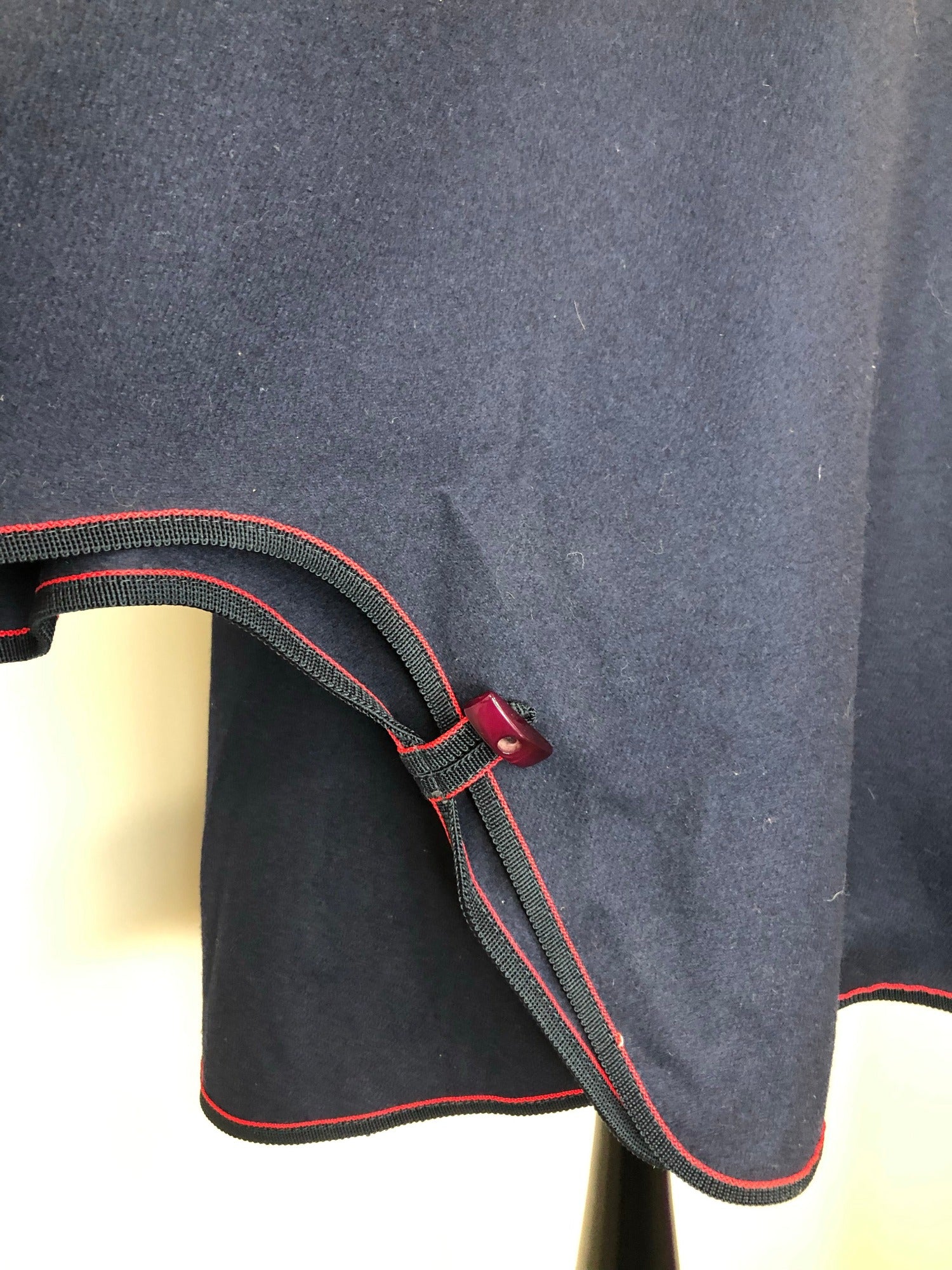 Vintage 1960s wool cape by Maurice Henri in Navy with a red and navy trim. The cape features a toggle front fastening.