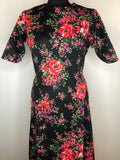 Original 1960s vintage Floral Dress by Miss Mary of Sweden in black with a red and green print. The dress has a rounded neck line, short sleeves and a zip back fastening.