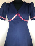 1960s Puff Sleeve Dress by Keynote in navy with a red, white and navy embroidered trim. Dress has short puff sleeves and zip fastening at the back.