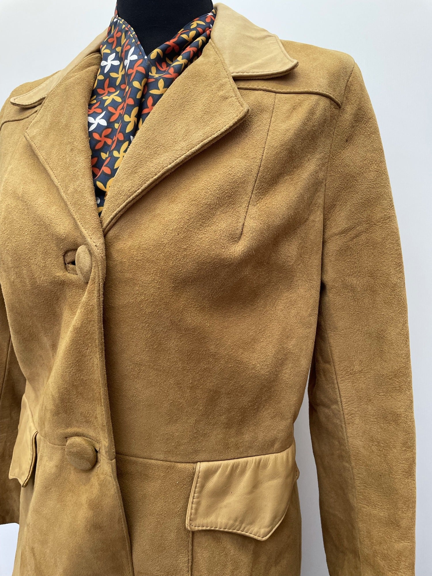 Womens original 1960s coat in mustard suede. Front pockets and button fastening. Leather trim collar and pockets.