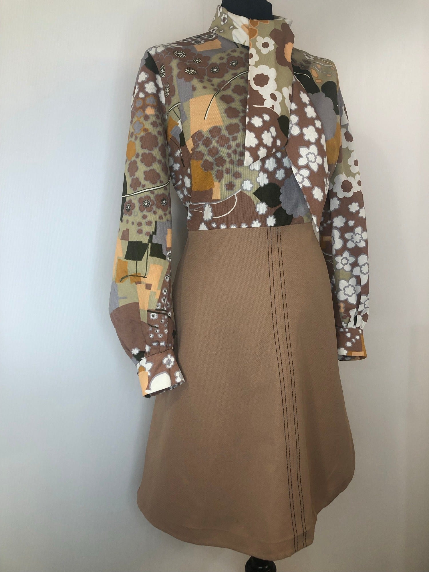 Womens original 1960s Patterned Pussy Bow Dress in brown, with a yellow, green and blue floral pattern. Features a back zip fastening, balloon sleeves and a pussy bow neck tie.