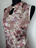 Original 1960s mod-era vintage shift dress made of silky, lightweight acetate with a classic purple and white daisy print. The dress features a large pointed collar with keyhole opening and white button fastening. There is a metal zip to the centre back.