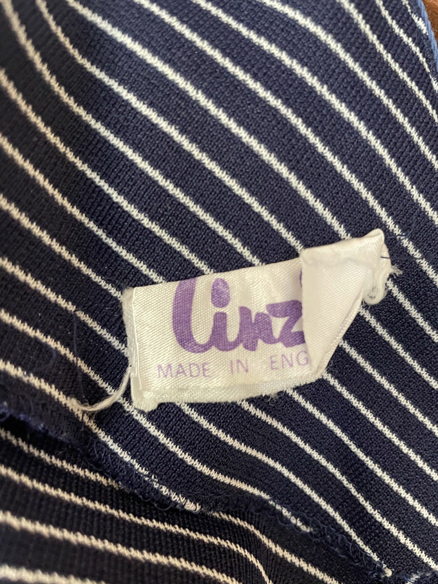 Womens original 1960s midi dress by Linzi in dark blue. Mod style with penny collar, decorative buttons, long sleeves and back zip fastening.