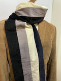 Mens original 1960s college scarf in a cord fabric. Black, grey, navy and white stripes.