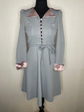 Very pretty original 1970s vintage dress by Van Allan in the style of a 1940s tea dress. The dress is made from a very light blue-grey stretchy polyester with pink silky acetate collar and cuffs and covered buttons to the front. The dress features an open neck with pointed collar, ruched shoulders and a removable waist belt.
