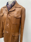 Mens original 1970s jacket. Safari style in leather. Three button fastening with four pockets. Belt loops at the waist but no belt included.