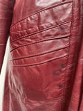 Womens original 1970s long jacket in burgundy. Leather material with pockets, button fastening and belted detail.