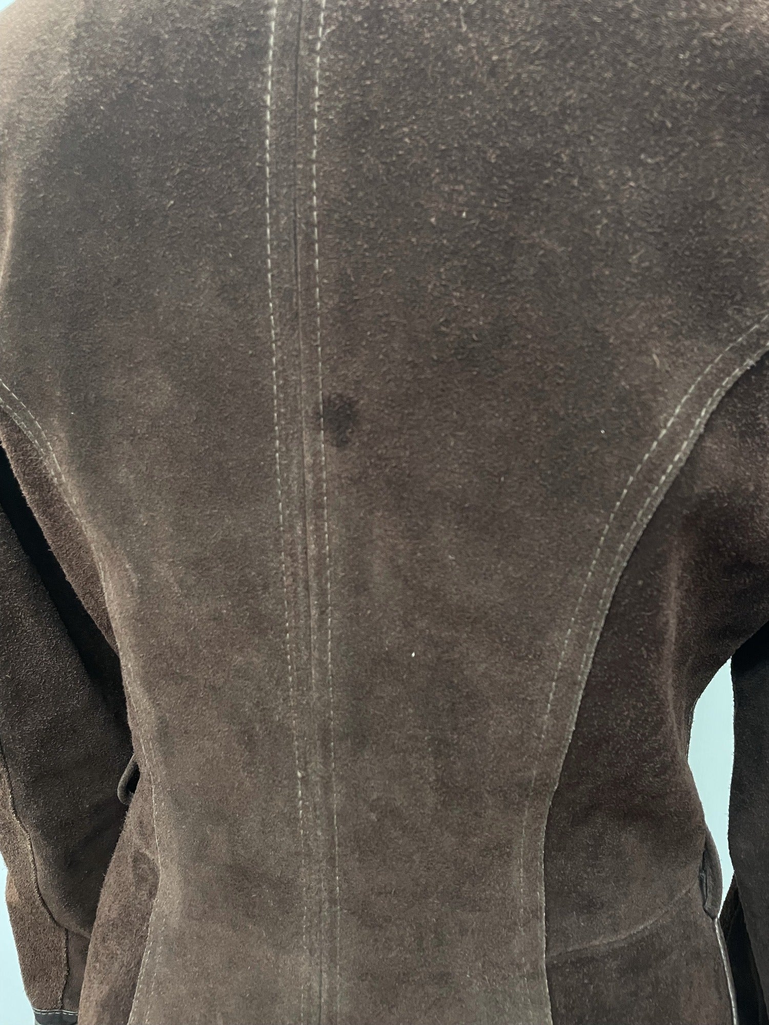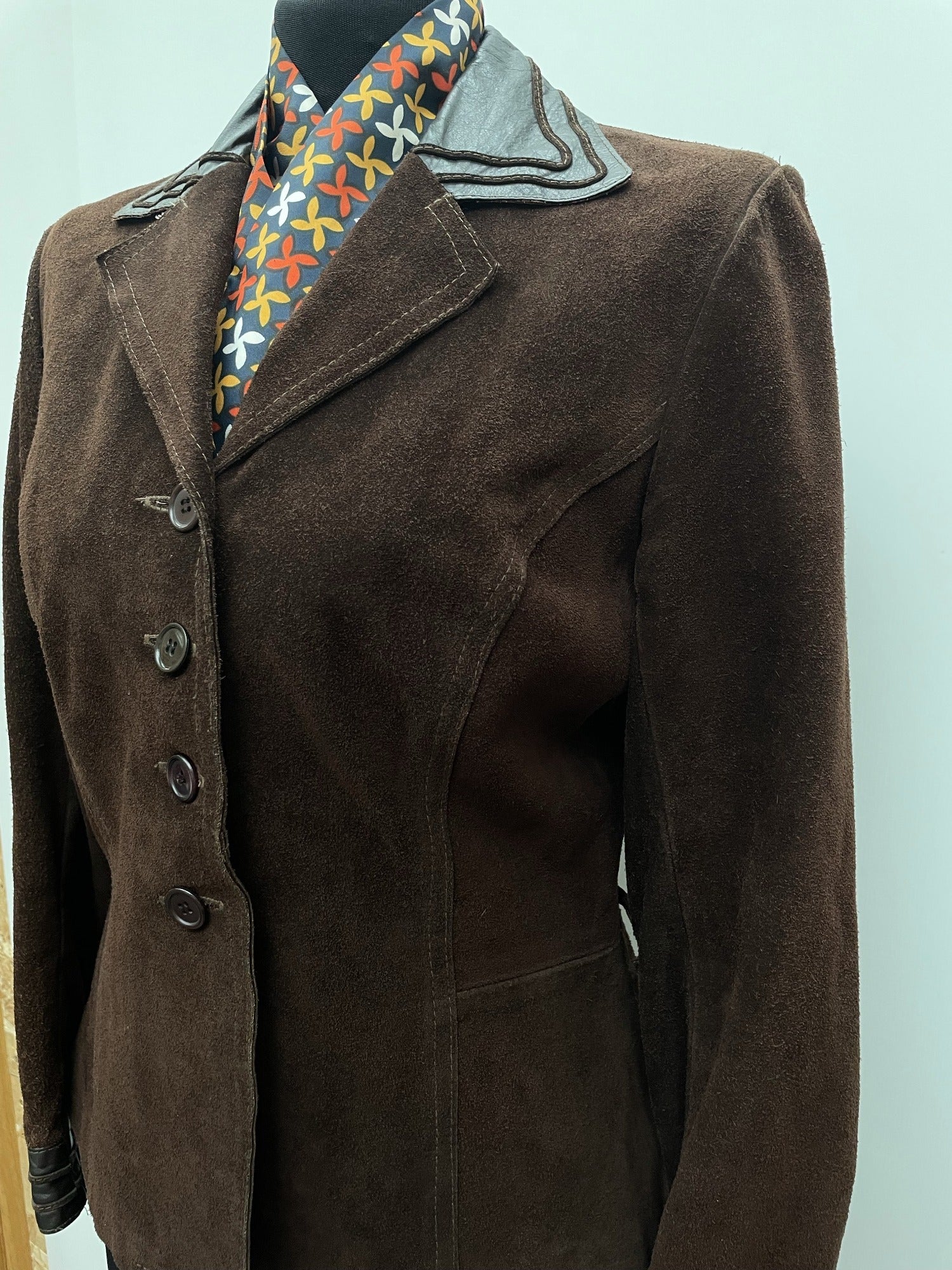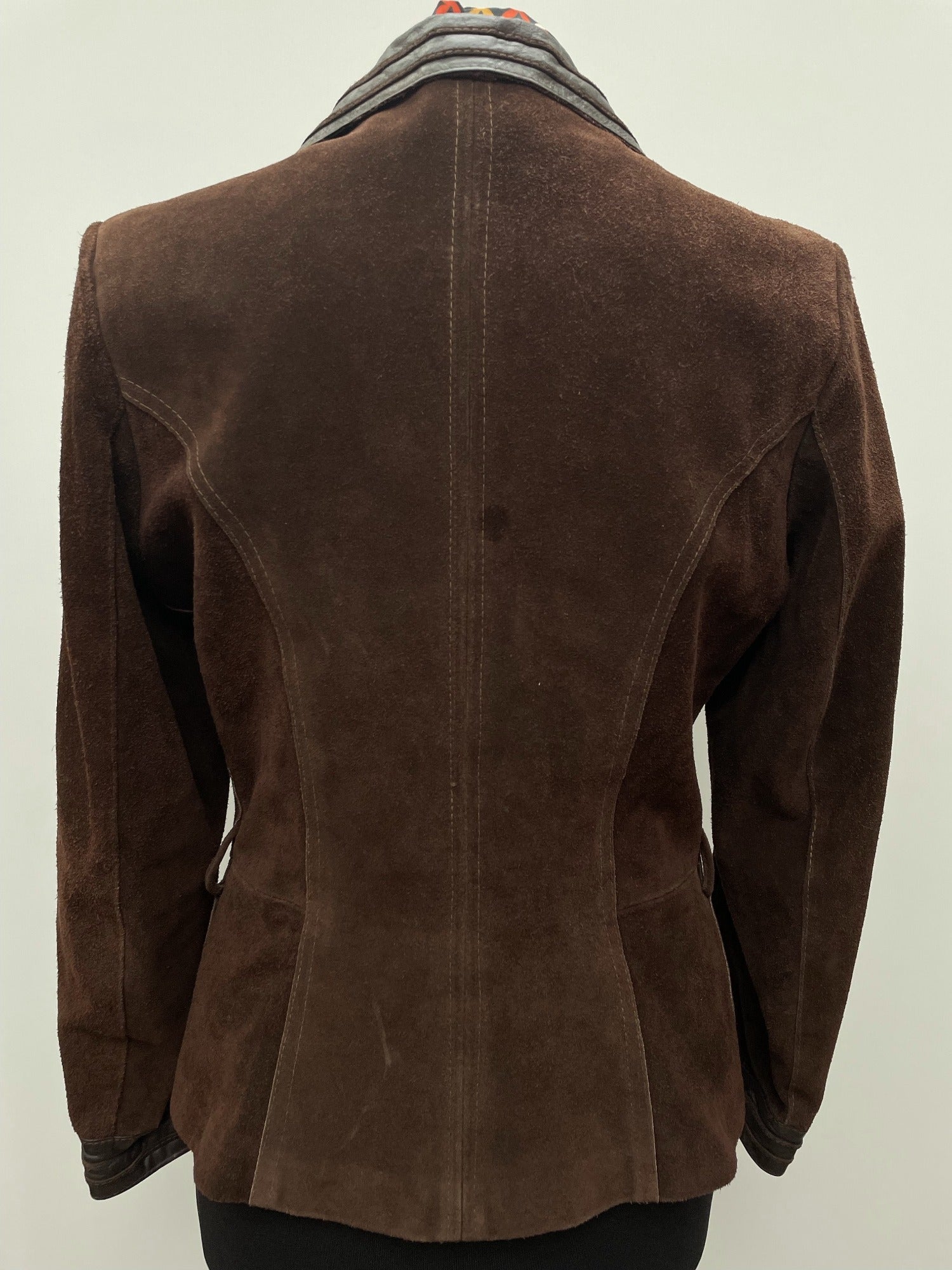 Womens original 1970s blazer style jacket by Highway in brown. Suede material with leather trim, front button fastening and large collar with a silk feel lining. Comes with original tags.
