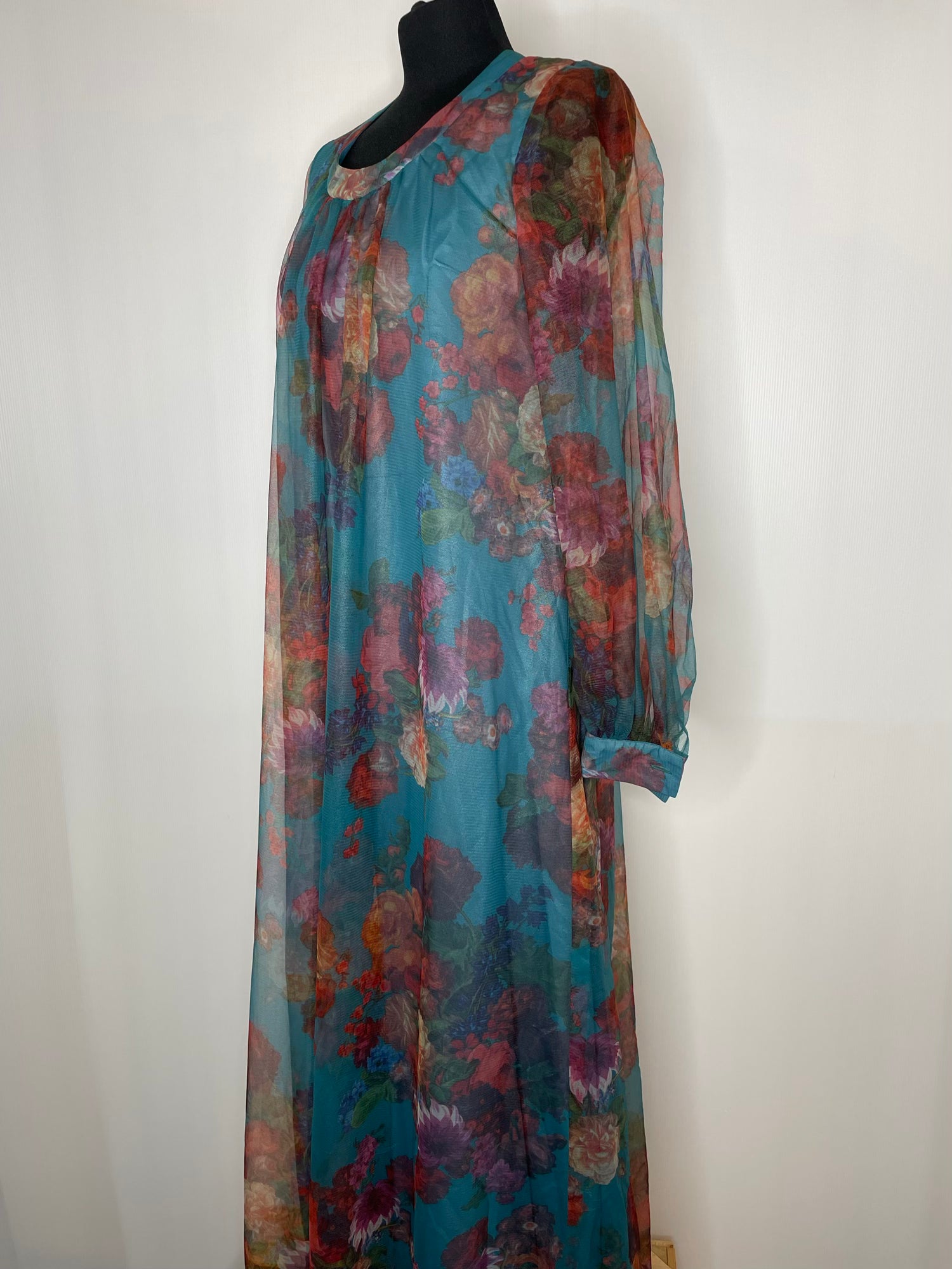 Beautiful original 1970s vintage maxi dress made of teal green polyester with a bold floral design all over. The dress is a fitted style with attached chiffon overlay and sheer full length sleeves with button fastening. Features a round neck and zip to the centre back.