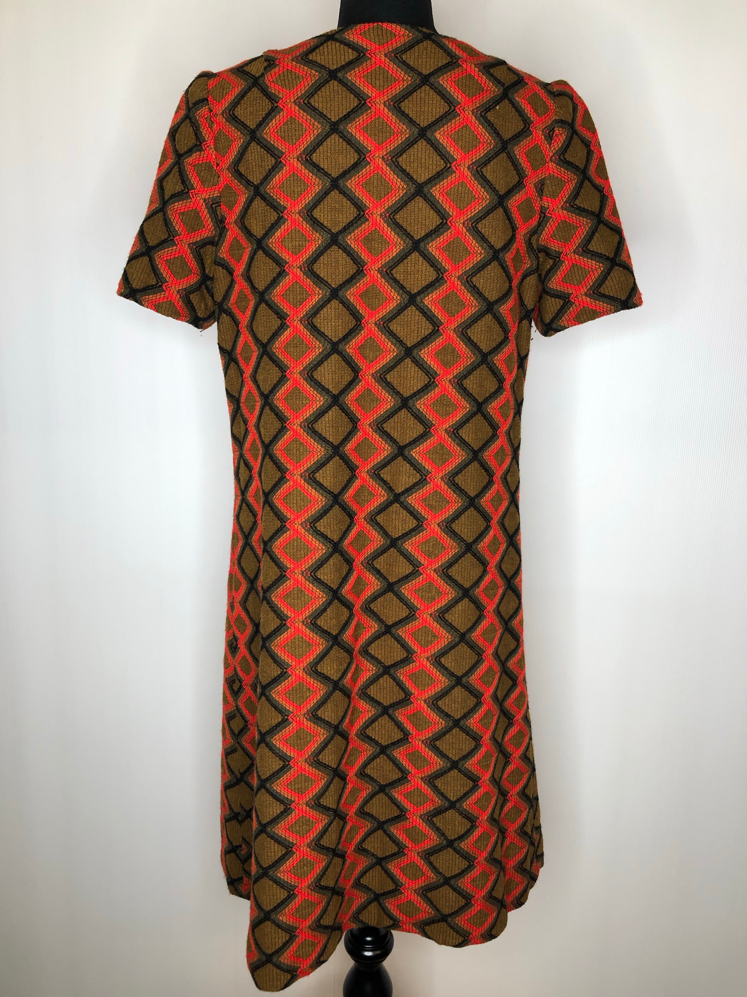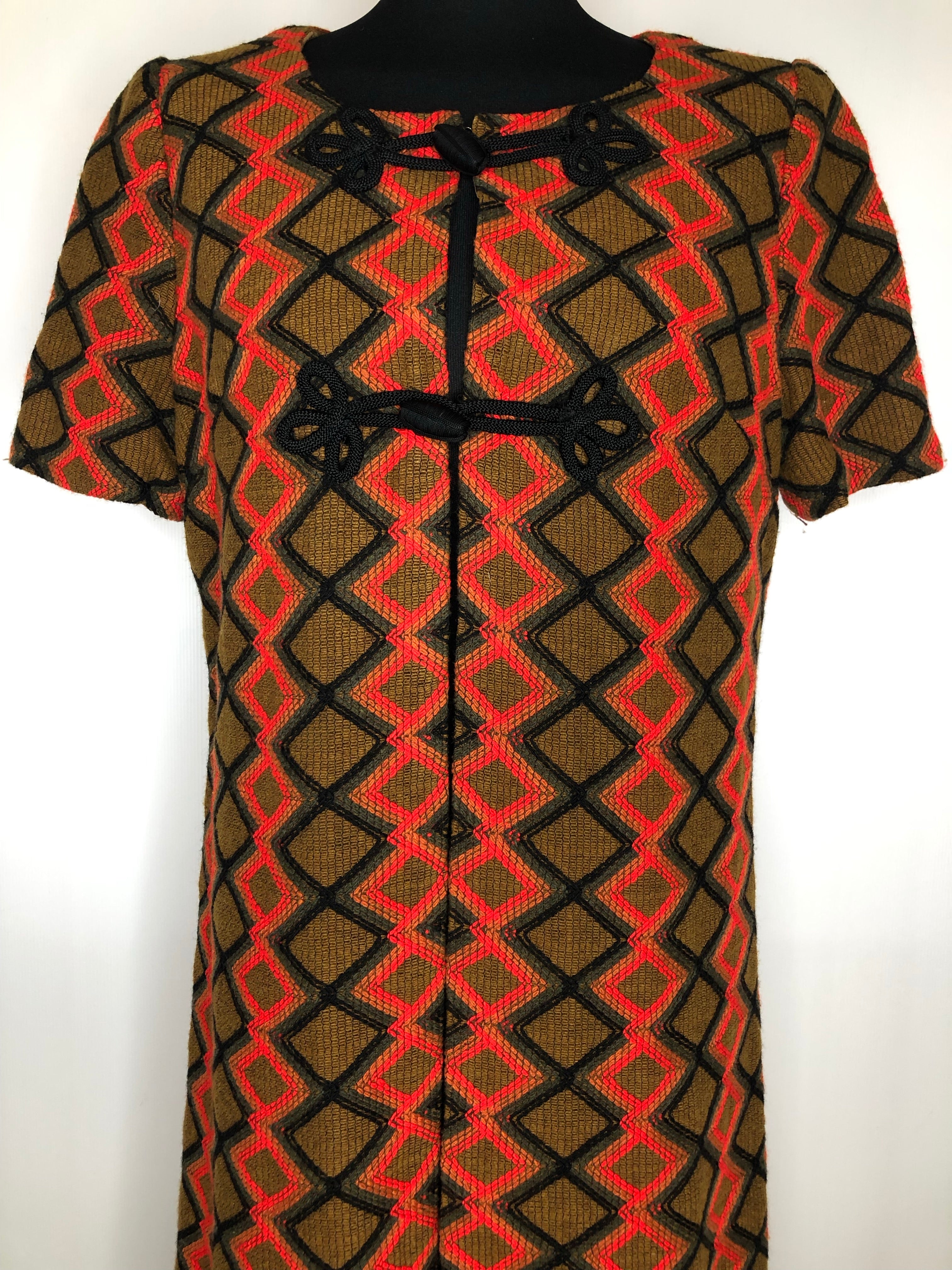 1970s Short Sleeved Embroidered Duster Jacket in green, with red, black, orange and diamond pattern. Features an open front with embroidered black toggle fastening and is fully lined.