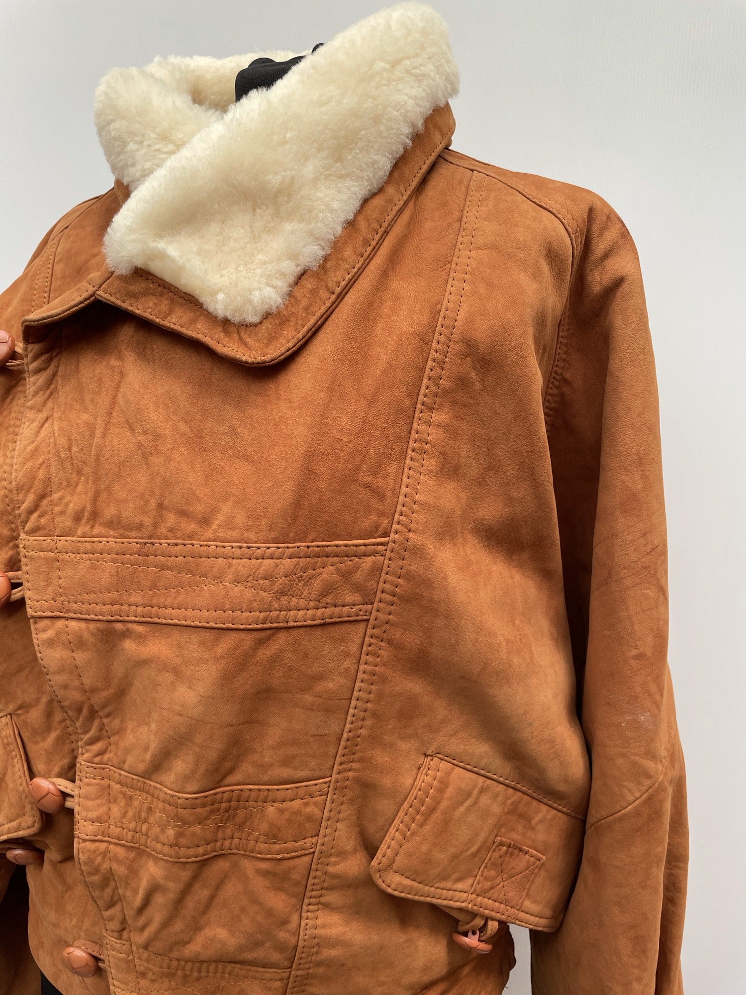 Womens original 1980s bomber style jacket in tan by Copyright. Wide fit cropped jacket with real sheepskin collar and quilted lining. Double fastening with zip and buttons, and side pockets.