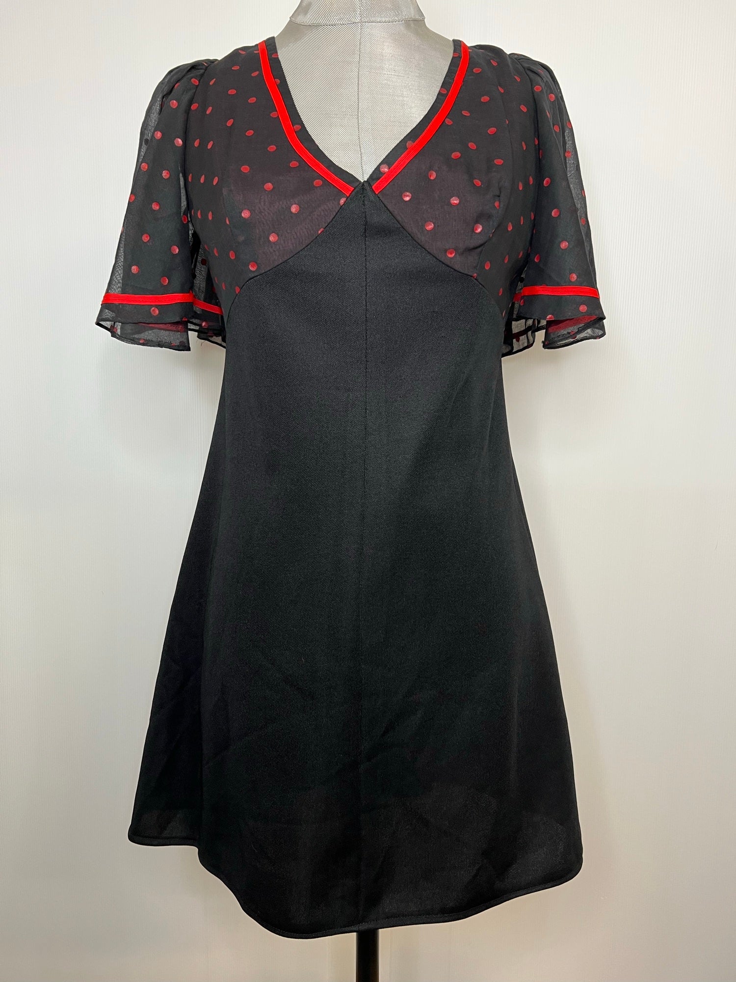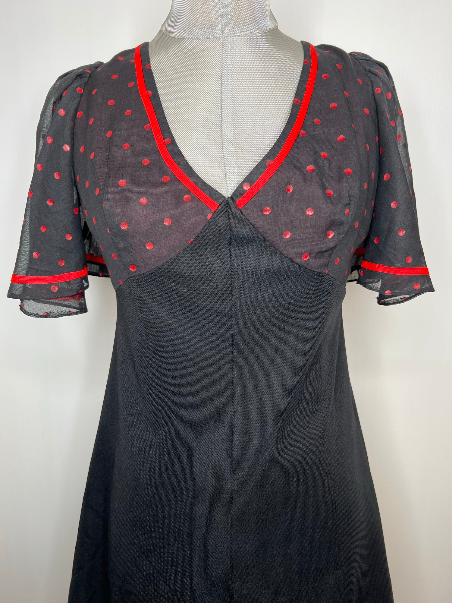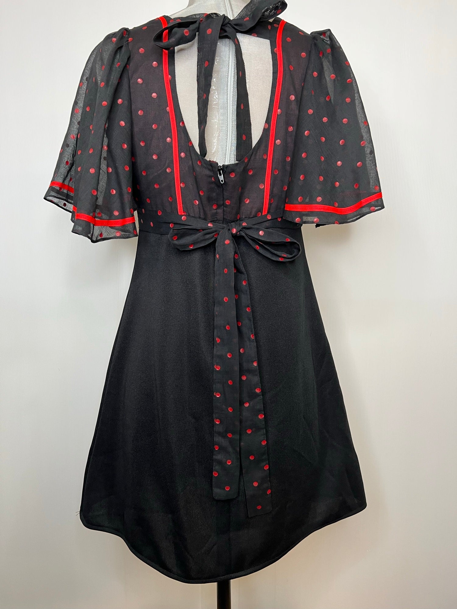 Vintage 1960s Polka Dot Angel Sleeve Mini Dress in Black and Red - Size UK 12